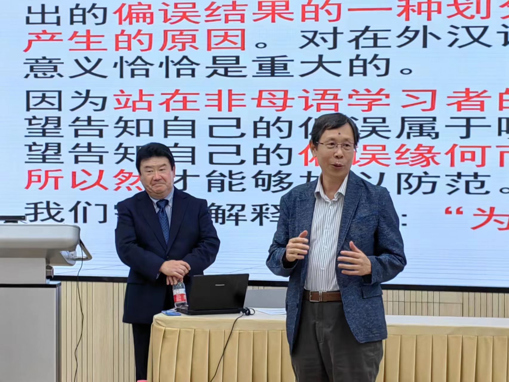 古川裕教授的讲座根据其在日本从事中文教育的经验,提出目前在日中文教学存在的问题,“不管是在课堂内还是课堂外,我们经常遭遇由日本学习者输出(说错、写错)及输入(读错、听错、译错)时的各种偏误”,同时指出,国内外现行的汉语教学语法体系还存在不足,需要不断修改和完善。古川教授展示了搜集到的大量偏误案例,并将其归类进行分析,如日本学生在应该使用可能补语的情况下使用了“不能+V”结构,或是将日语习惯套用在汉语的特殊句式中,或是在遇到相似的文字时忽略了汉语双音节词居多的特点。教授与在座教师、同学们探讨了这些偏误原因,提出在日中文教学面临的问题和需要的教师资源以及应该培养的人才,为提升在日中文教学的质量提出了建议。